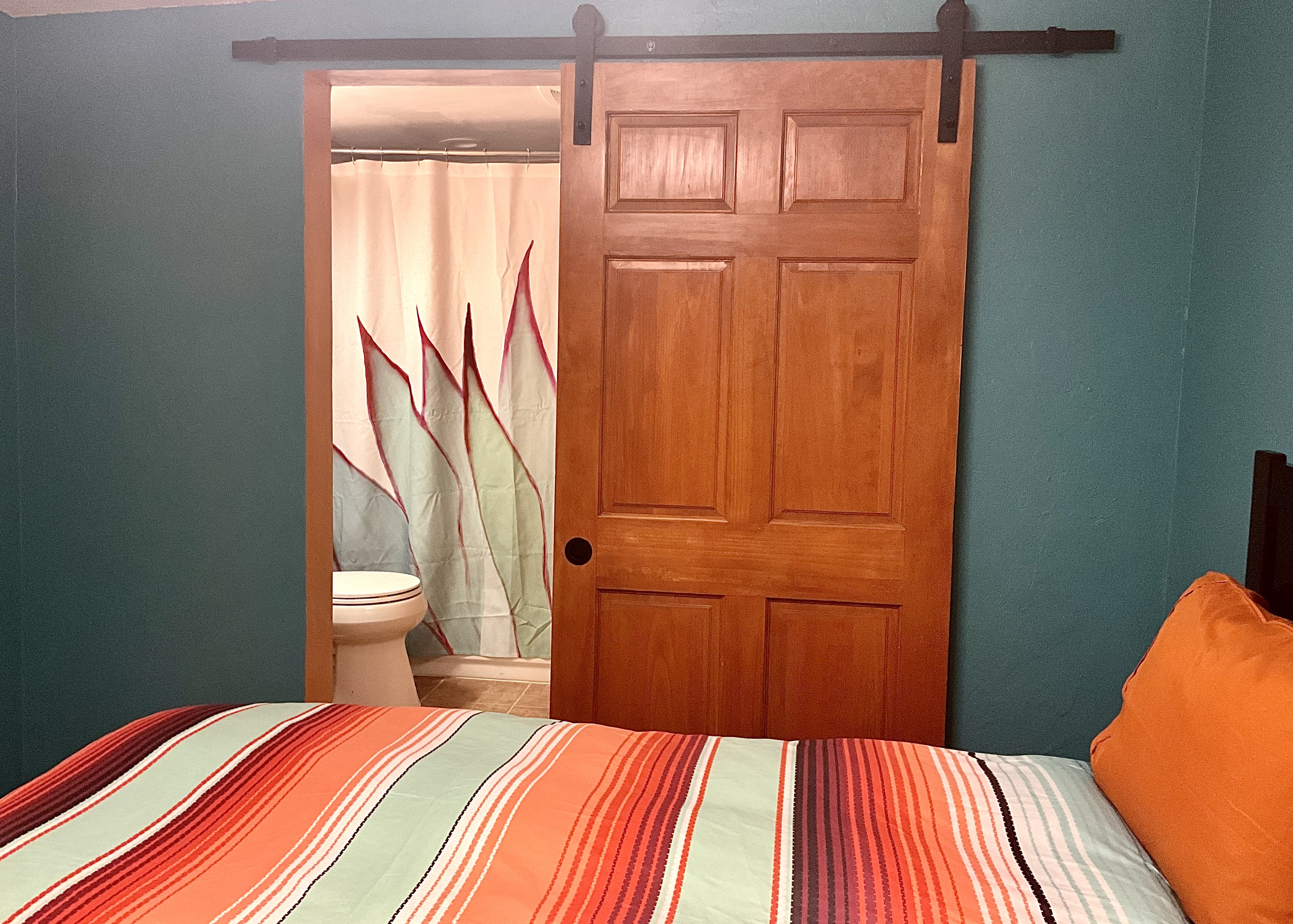 The Casita has two rooms and a full bathroom. The entry room has a couch, table with two chairs, TV, refrigerator, microwave, cooktop with two burners, and sink. It does not have a full kitchen, but guests can bring food in, have it delivered (Uber Eats, Door Dash, etc.). or use the outdoor grill. Guests have access to a washer and dryer. The bedroom has a full bed. A sliding barn door separates the bathroom and bedroom. The space is private and quiet, with access to outdoor seating areas. Once you close the entry gate, you and your dog have full access to the back area, which is completely gated.
