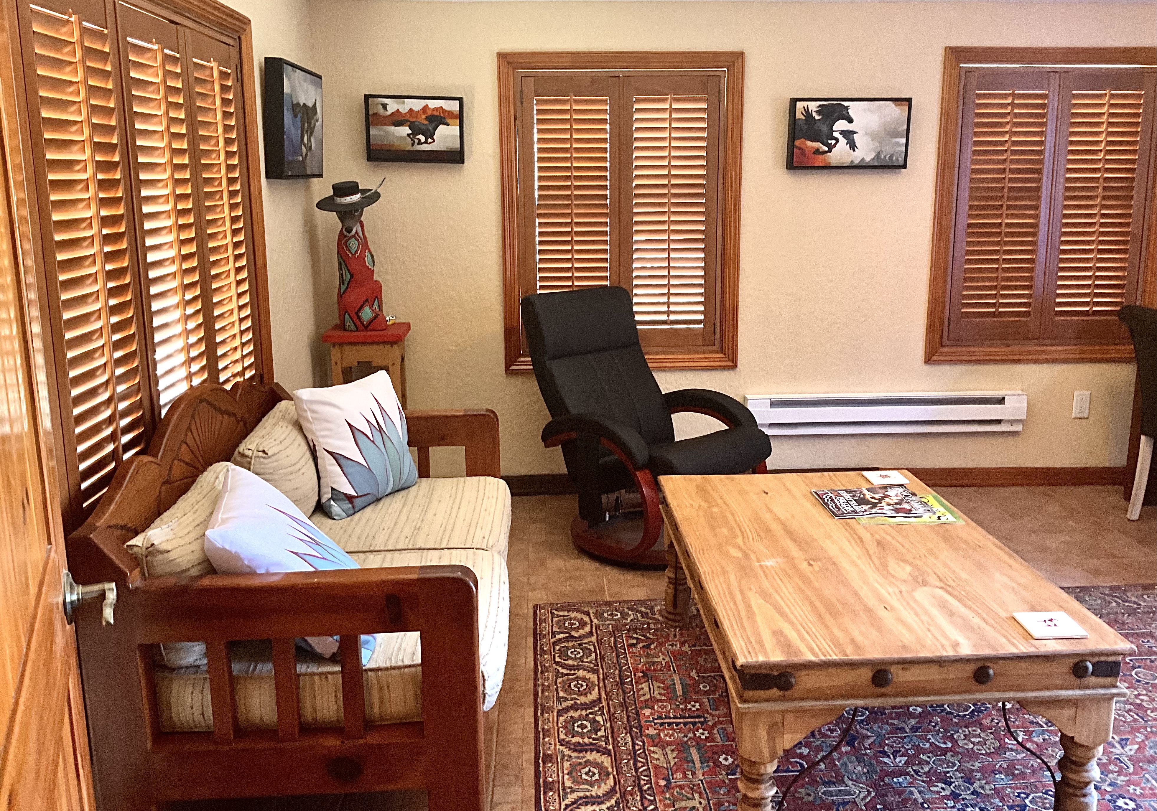 Overnight visitors can take in the expanse of the night sky, without city lights to interfere. The Casita contains art by blue-chip New Mexican folk, Native American, and ceramic artists, leaving you feeling as if you are sleeping and resting in a unique gallery setting. By day, you hear the birds. By night, you might hear the coyotes.