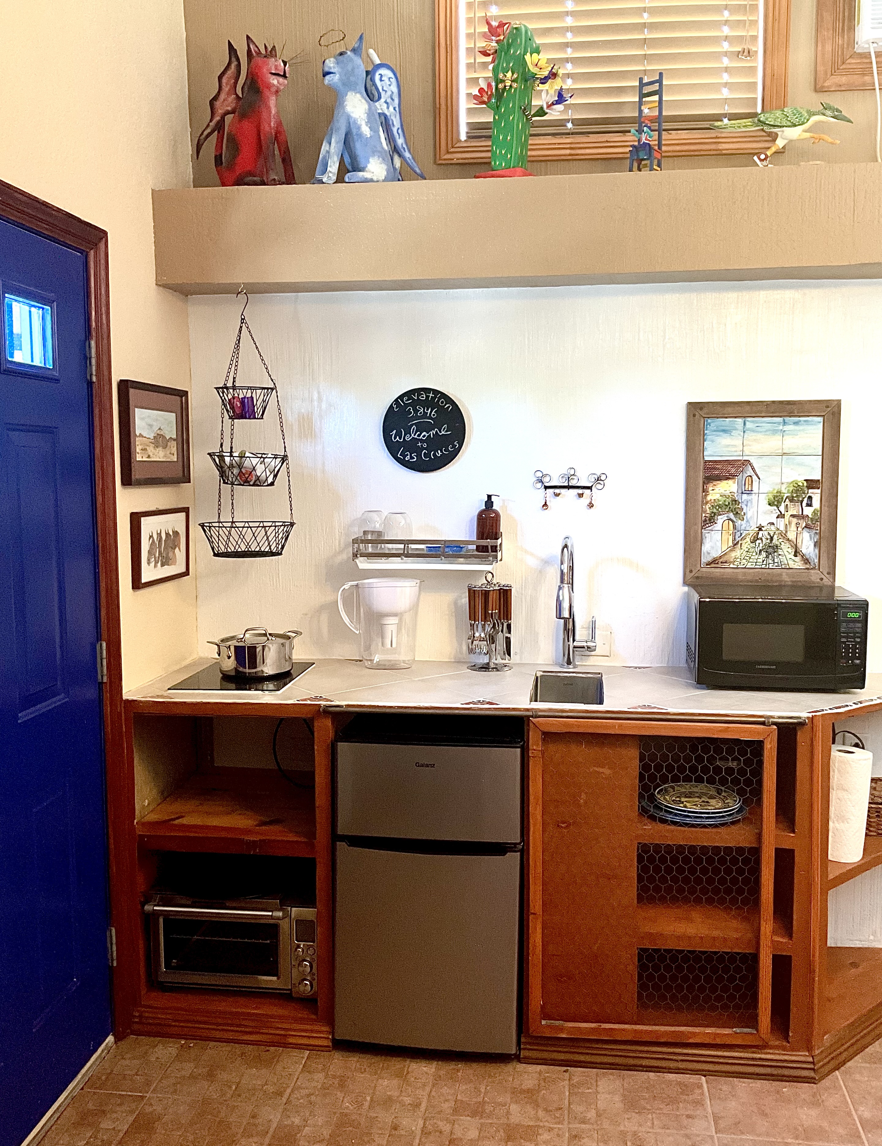 Pajarito Casita is a 320 square foot space, offered as short-term rental space for 1-2 people (two dog maximum). Rental periods are for 1-10 nights. The space can be rented through Airbnb, VRBO, and MisterBandB rental sites (Under the title, Pajarito Casita; Cozy, Peaceful, Pets). The Casita is located in a rural part of Las Cruces, 3 miles from the Mesilla Plaza. Private parking near the Casita entrance. The Casita is licensed/registered with Doña Ana County.